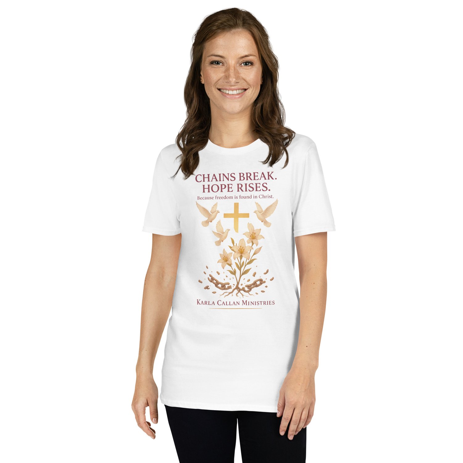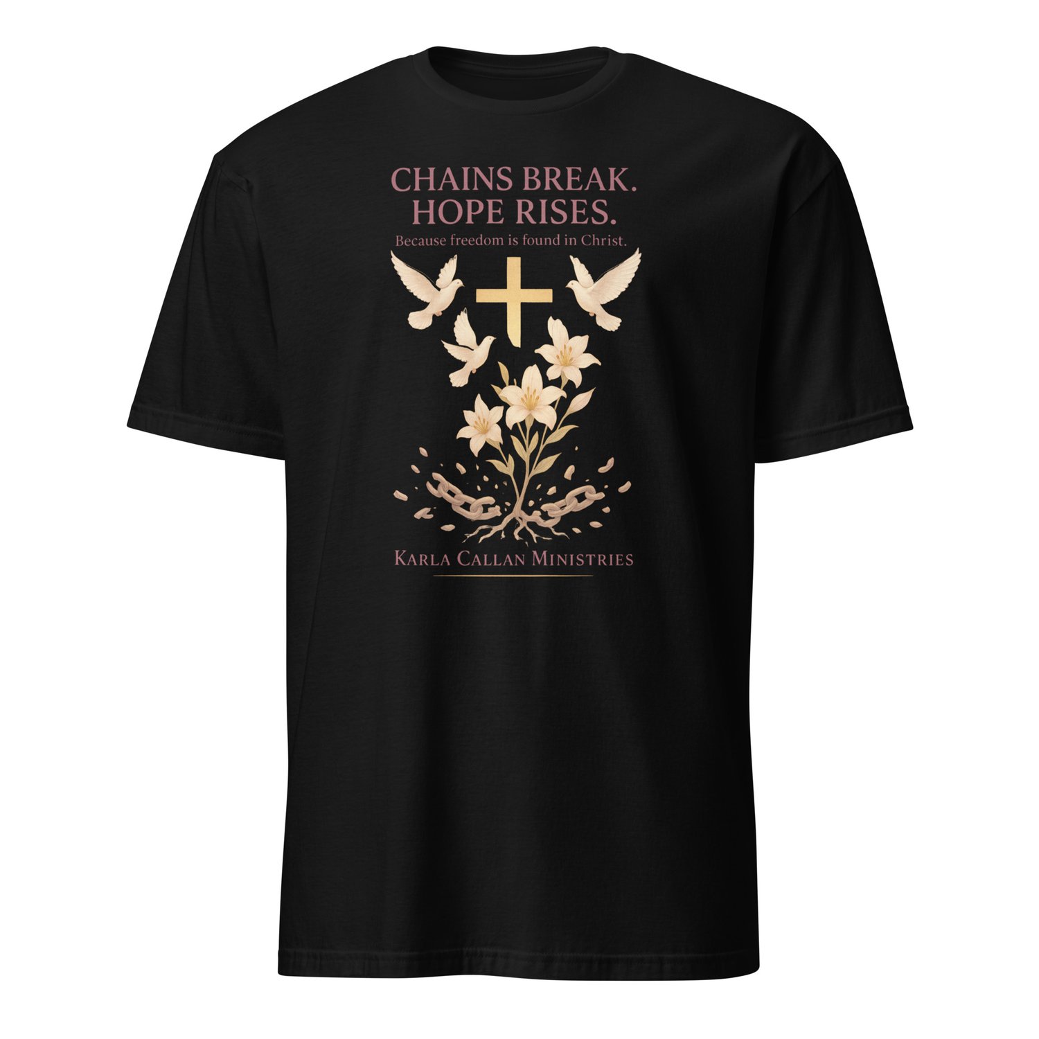 This tee features shattered chains transforming into lilies and doves under a golden cross—perfect for anyone declaring their freedom in Jesus. Feminine yet fierce, it’s a symbol of spiritual breakthrough.