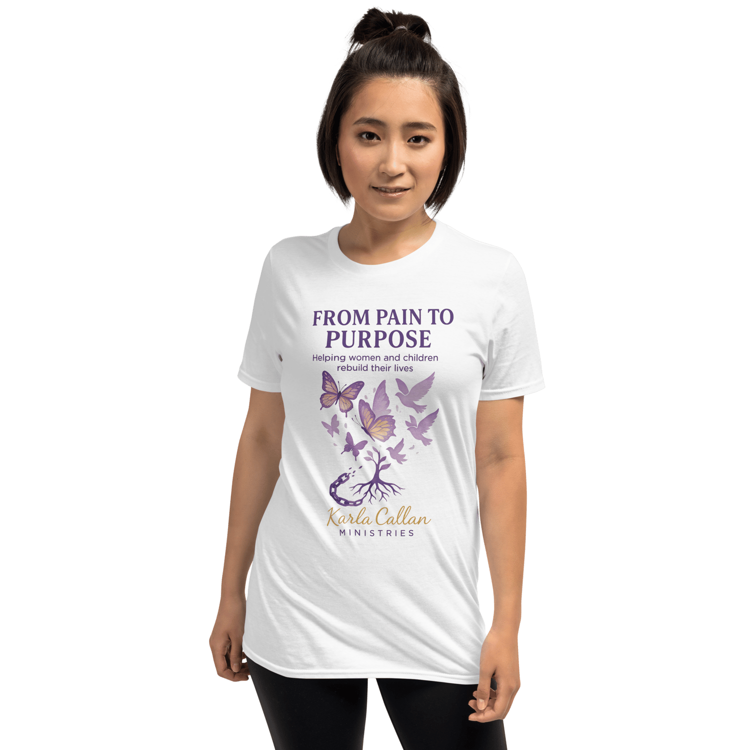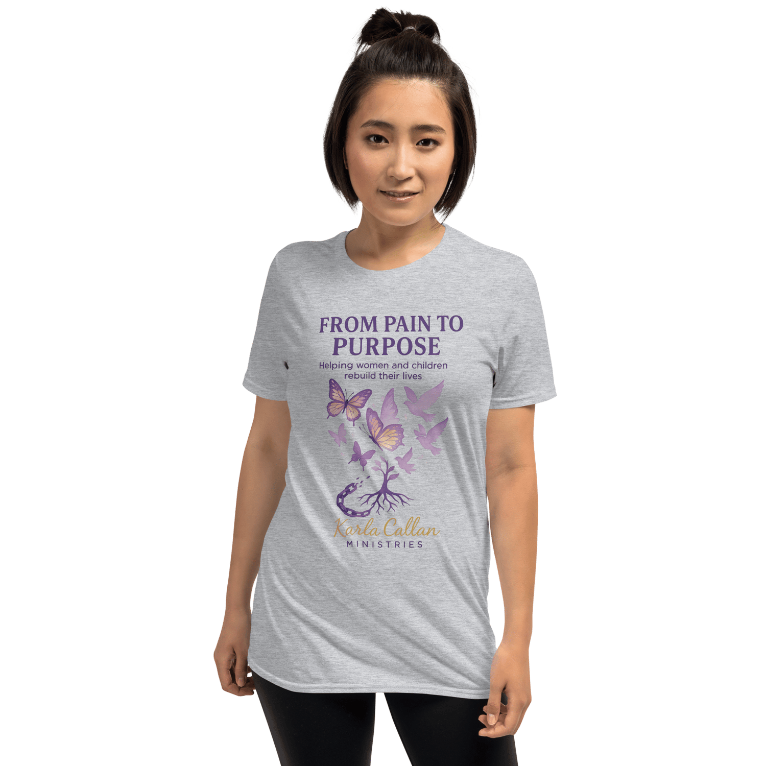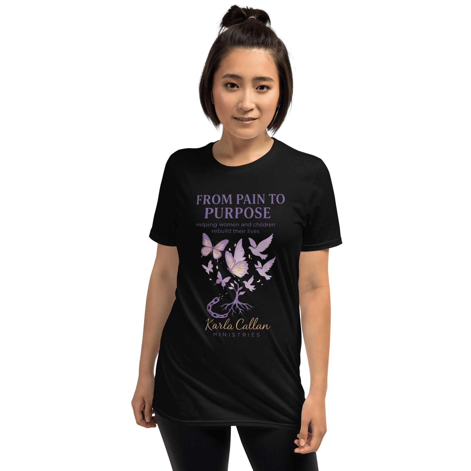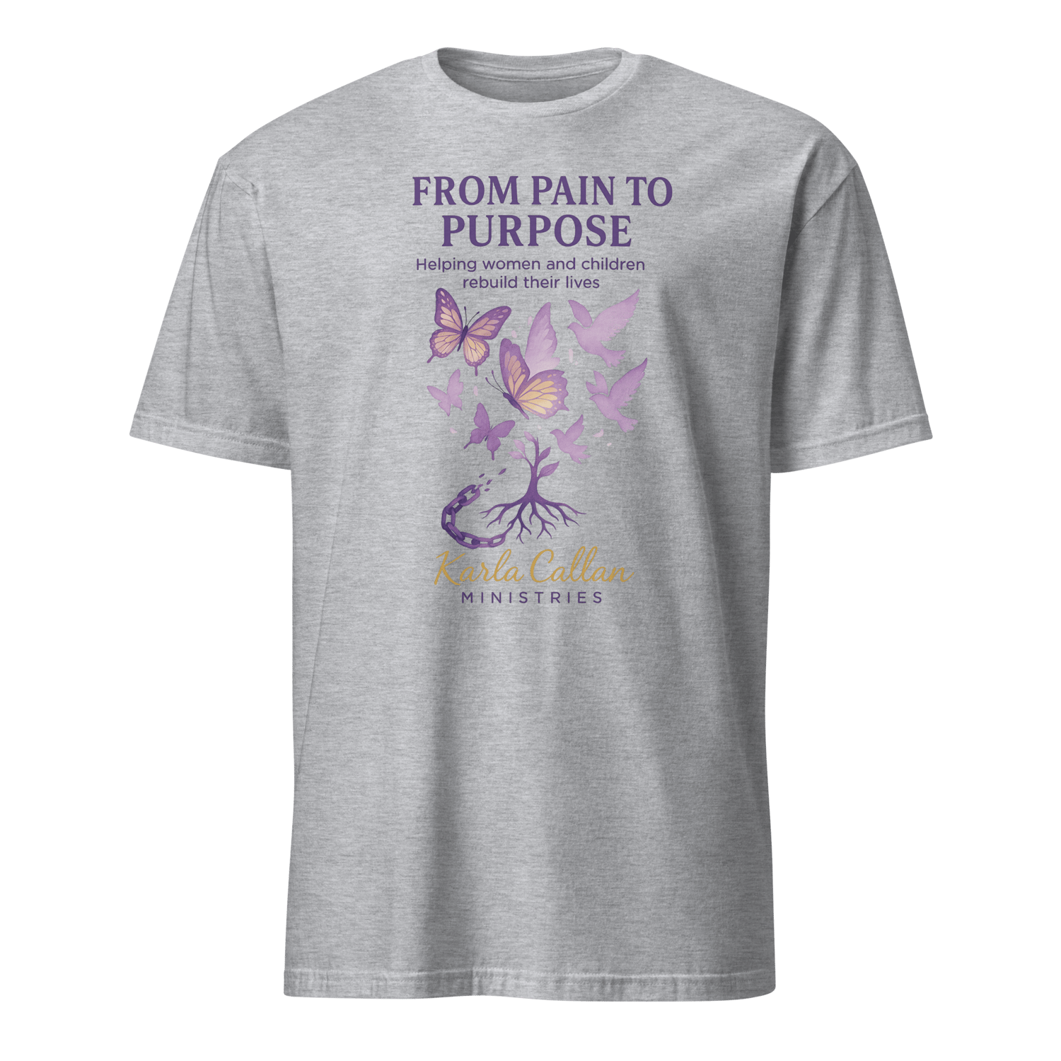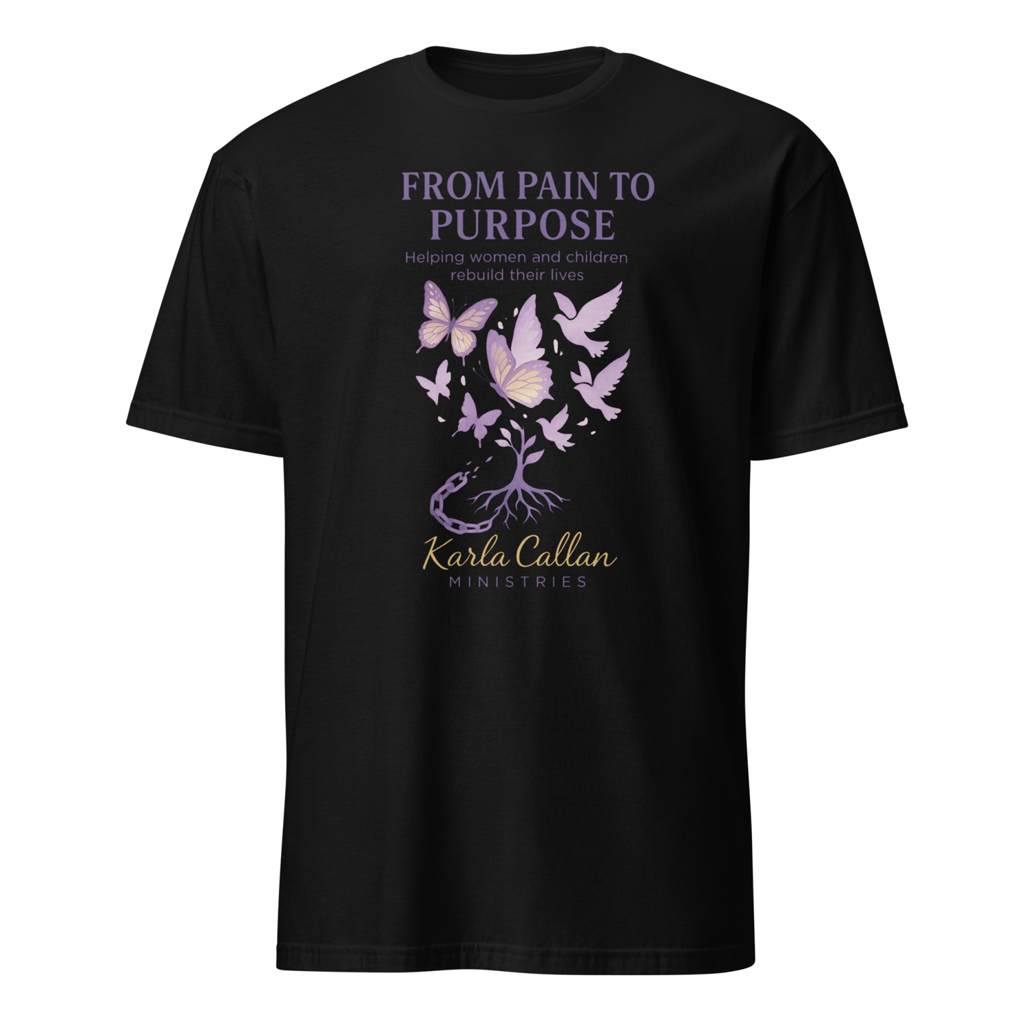This inspiring “From Pain to Purpose” t-shirt reminds women and children that healing is possible through Christ. Designed with soft purples and uplifting butterflies breaking free from chains, this tee represents restoration and hope.