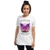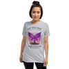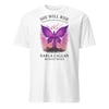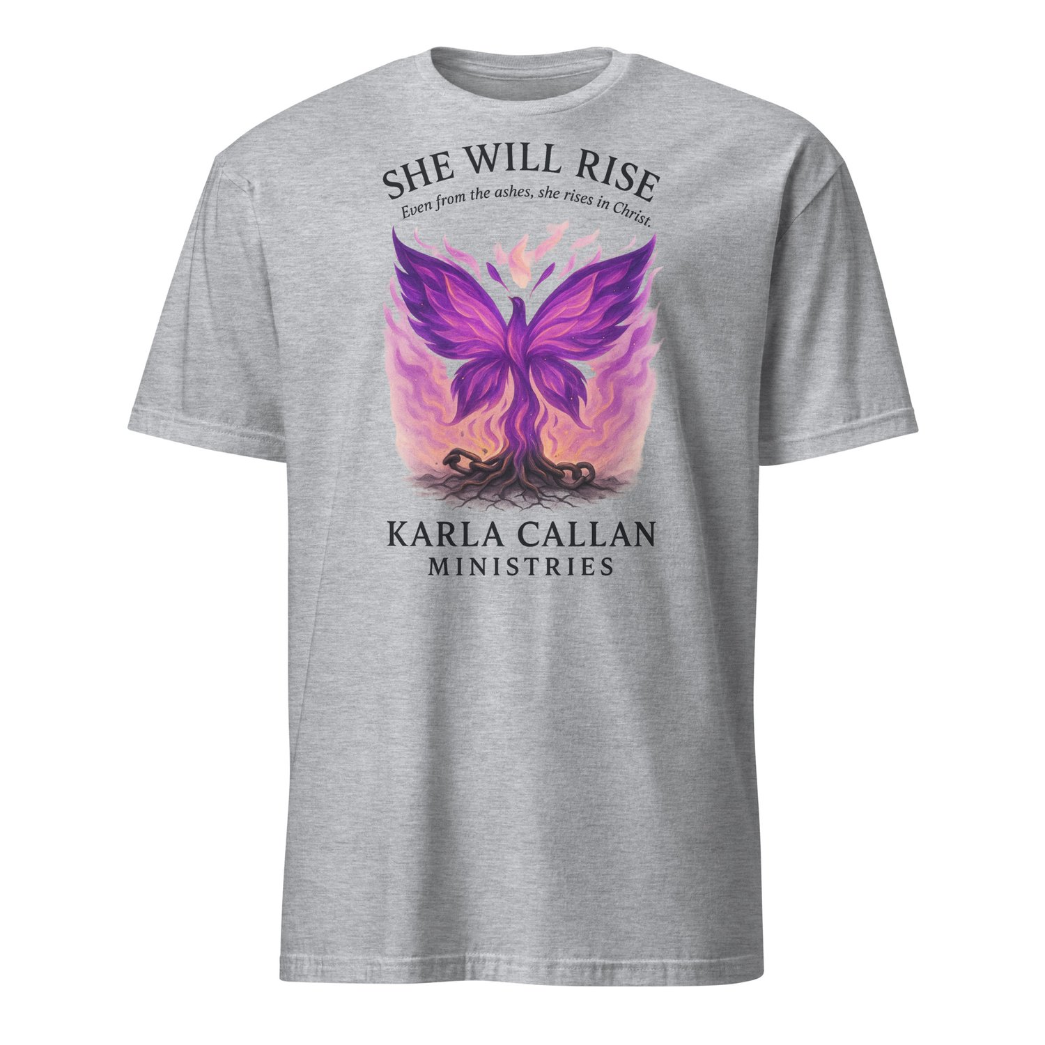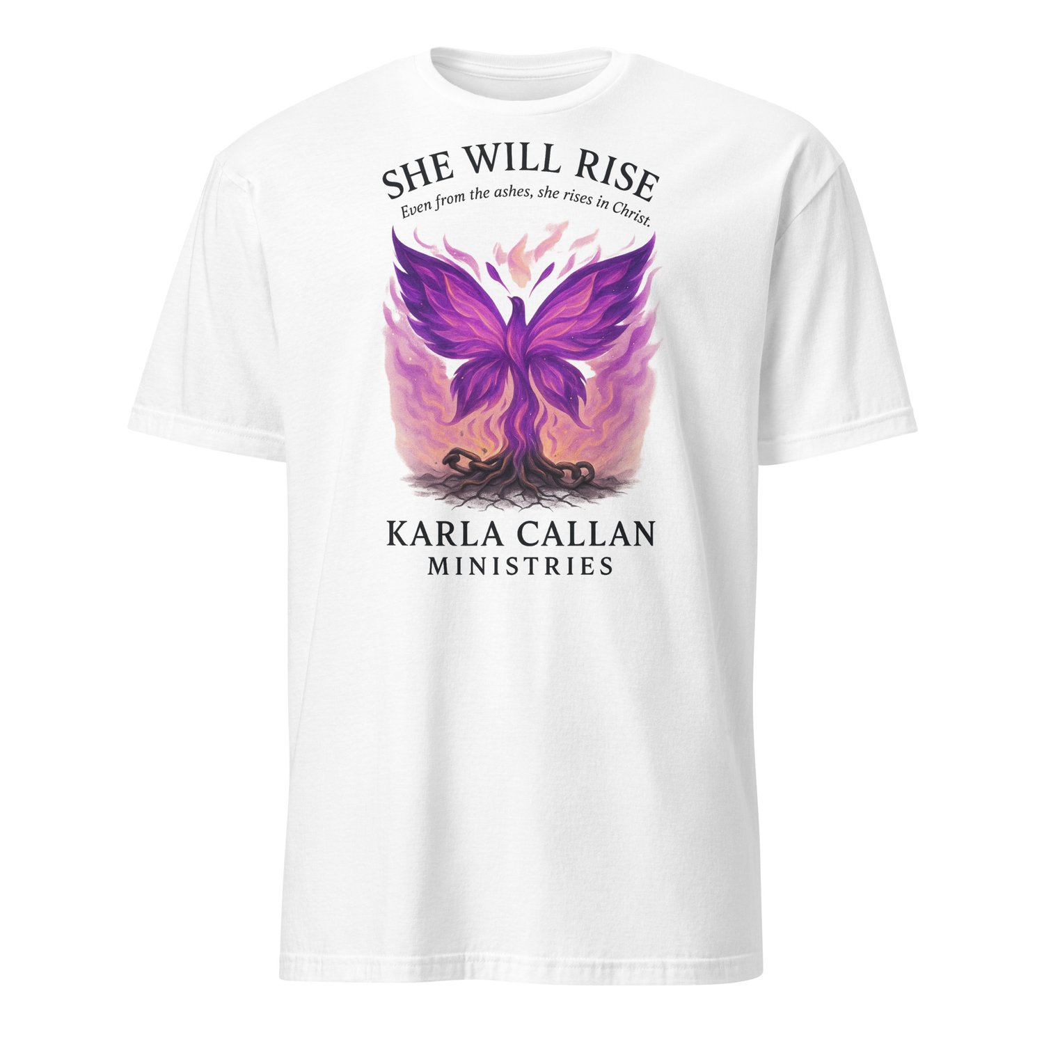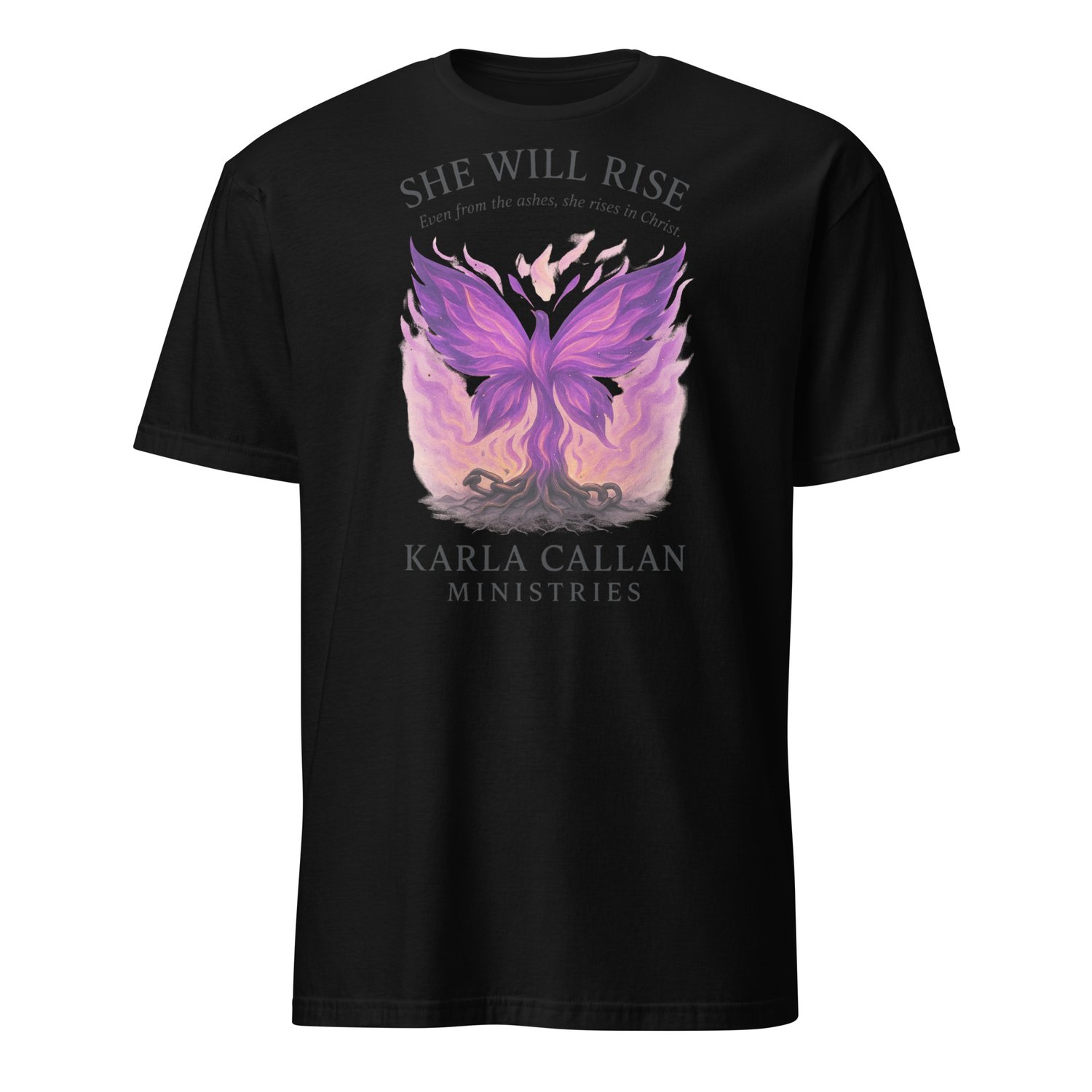 “She Will Rise” captures the beauty of rising from ashes with Christ. Featuring a phoenix-style butterfly in radiant purple flames breaking from chains, this tee represents victory, freedom, and divine resilience.