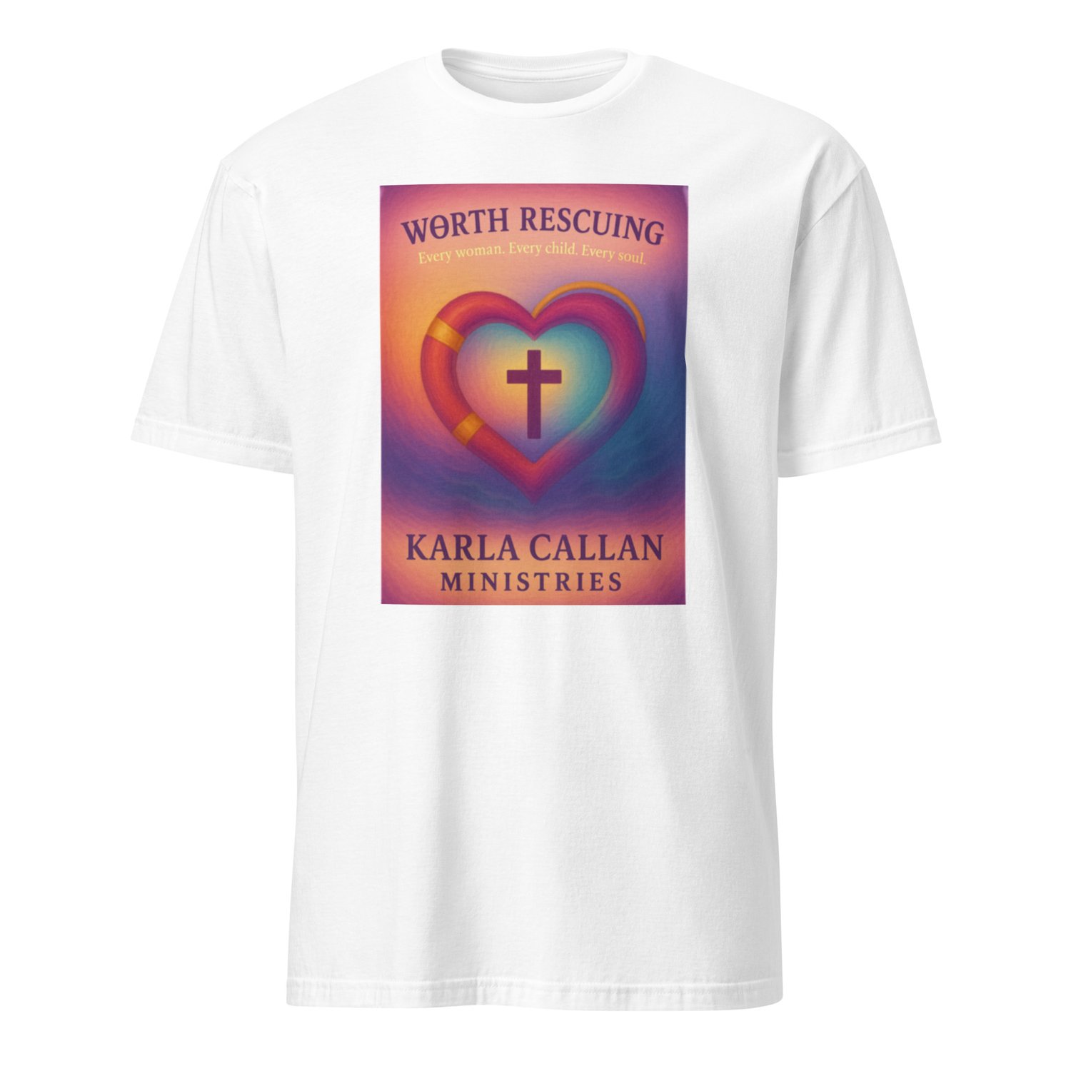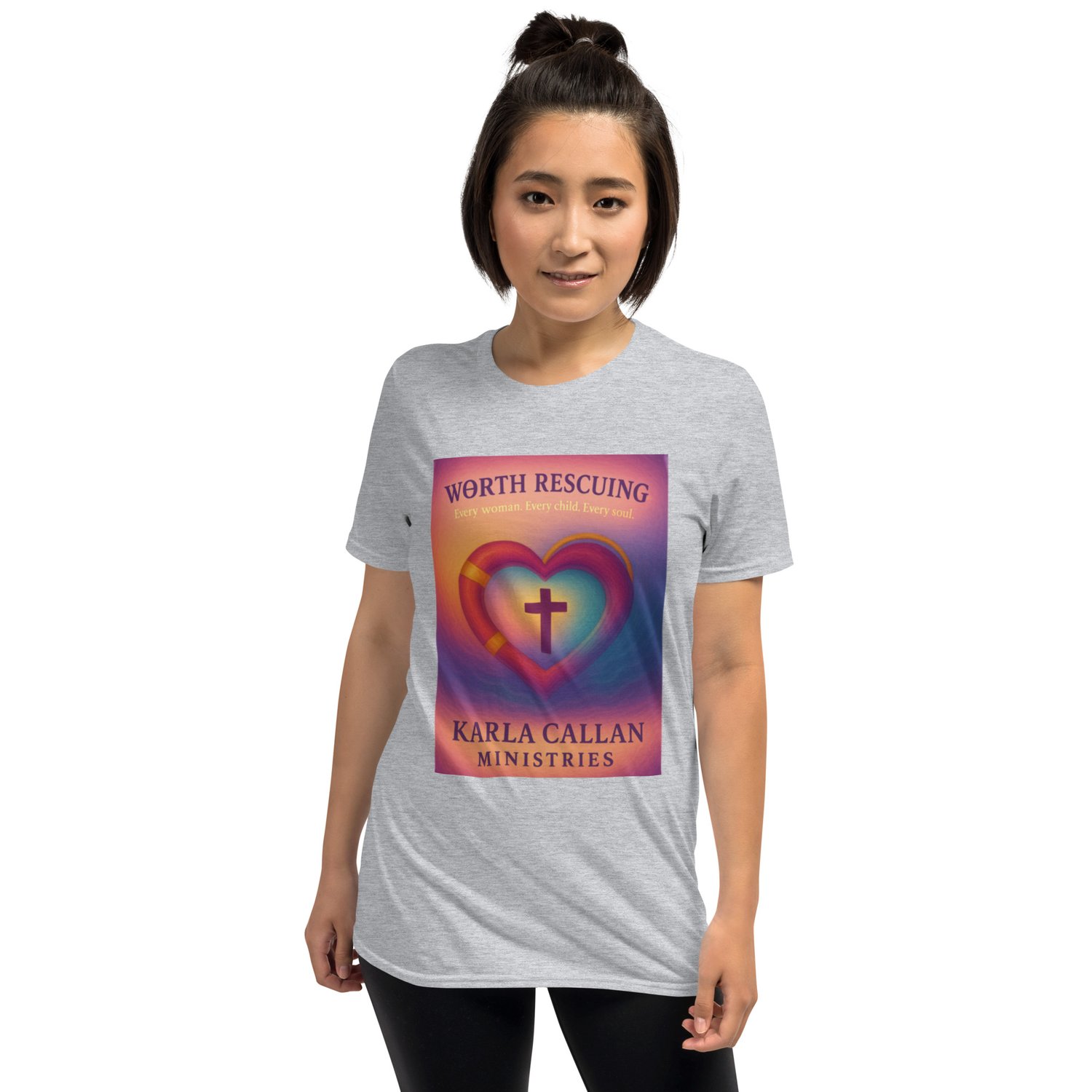 Every soul matters. The “Worth Rescuing” shirt combines a rescue ring and heart around the cross to remind us that every woman, every child, and every soul is worth saving.